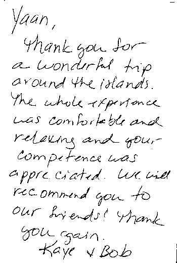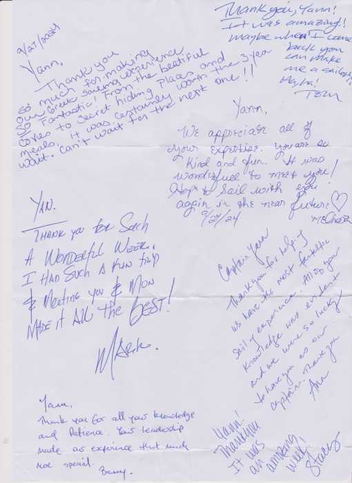 What a wonderful week!  Everyone was so impressed by the beautiful sea, the fantastic food and of course the professionalism of our crew.  You and Monique were a great team and we ALL appreciate your efforts to make this week special.